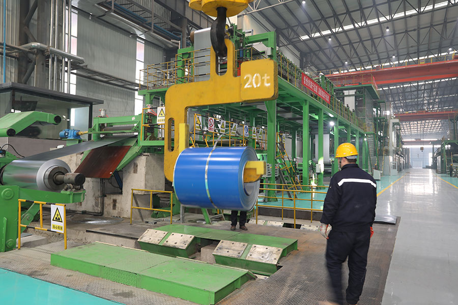 We have established four 150 m/min color-coated high-end automation production lines. In pressure testing of roller, timely adjusted first coat and top coat dual-roller coating head can be designed with dual-coating and dual-drying process. In online thickness testing of primer and finish paint wet film, top coat can be finished by U-type dual-coating head machine. Roller is amounted in online scraper and paint preparation constant temperature system. Protective film laminating machine is installed on online stroboscope examining table. Outlet section is capable of automatic coil separation, threading, taking and discharging. Coiling machine is configured with EPC system, so as to realize aligned coiling of finished steel coil, and coiling helper and seamless coiling block, so as to avoid indentation of finished coil. Coated steel sheet, which is light, beautiful and highly resistant to corrosion and can be directly processed, refers to a brand new raw material for building, shipbuilding, vehicle manufacturing, furniture and electrical industries and has good effect on substitution of steel for wood, high-efficiency construction, energy saving and pollution control. With process speed at 150 m/min, we can produce 120,000 t products on a yearly basis, whose width is within 914~1,250 mm and thickness is within 0.2~1.2 mm.