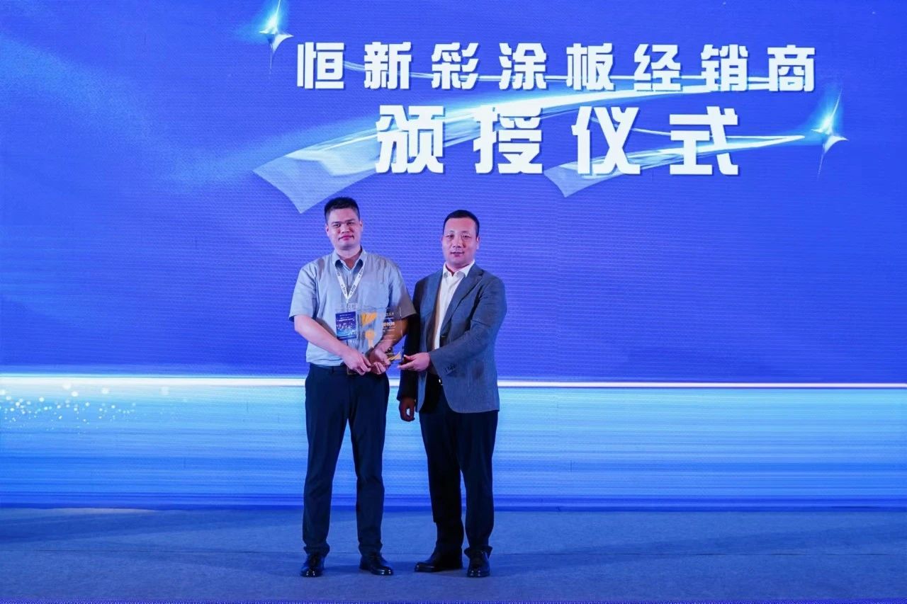 在恒新彩涂板經(jīng)銷商授權(quán)儀式上,京華兆建公司總經(jīng)理陳鐵柱先生向聯(lián)合舉辦方佛山市常松鋼材貿(mào)易有限公司總經(jīng)理戴清洪先生頒發(fā)了授權(quán)牌,并同與會嘉賓上臺合影留念,在現(xiàn)場嘉賓的共同見證下開啟深度友好合作新篇章!