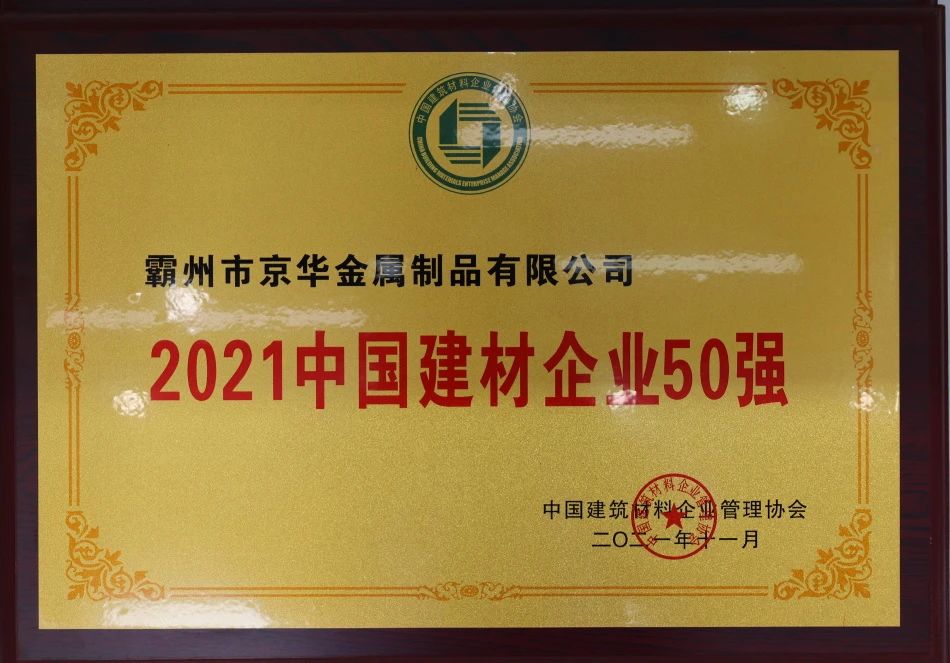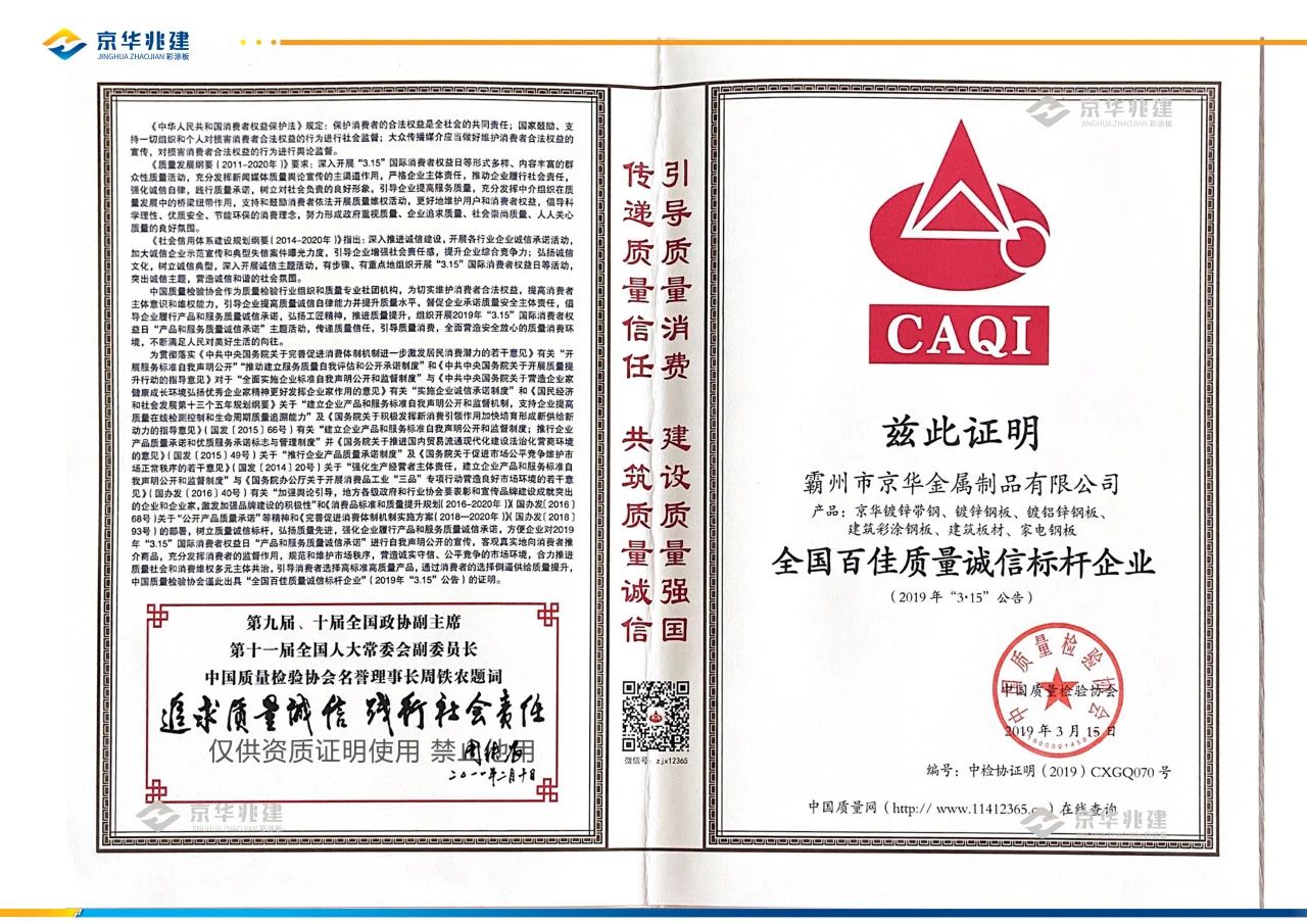 霸州京華金屬制品有限公司作為一家專(zhuān)業(yè)生產(chǎn)冷軋帶鋼、鍍鋅帶鋼、鋅鋁鎂帶鋼、冷軋鋼板、鍍鋁鋅鋼板、彩涂鋼板的現(xiàn)代化民營(yíng)企業(yè),自創(chuàng)立以來(lái),始終堅(jiān)持創(chuàng)新,不斷擴(kuò)大生產(chǎn)規(guī)模,通過(guò)了質(zhì)量管理體系ISO9001認(rèn)證、歐盟CE認(rèn)證等多項(xiàng)權(quán)威認(rèn)證,且榮獲了“全國(guó)百佳質(zhì)量誠(chéng)信標(biāo)桿企業(yè)”、“中國(guó)建材企業(yè)50強(qiáng)”、“重合同守信用企業(yè)”等多項(xiàng)榮譽(yù)。